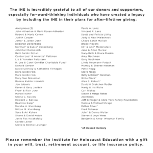 Our mission is to provide educational resources, workshops, survivor testimony, and integrated arts programming to students, educators, and the public. The IHE provides support to Holocaust survivors in our community.